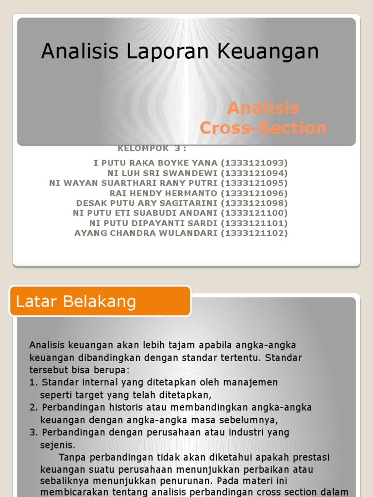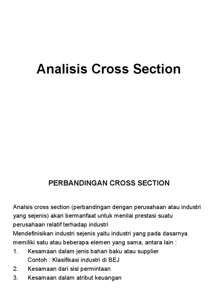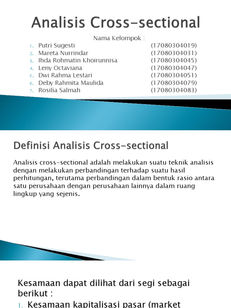 Studi cross sectional memungkinkan penggunaan populasi dari. Perbandingan Cross-Section Analisis Cross-Section perbandingan dengan perusahaan atau industri yang sejenis akan bermanfaat untuk melihat prestasi perusahaan relatif terhadap industri dan juga bermanfaat dalam kasus khusus seperti untuk menentukan bonus. PPT - Macam-macam teknik analisis Laporan Keuangan PowerPoint Presentation - ID4751752.